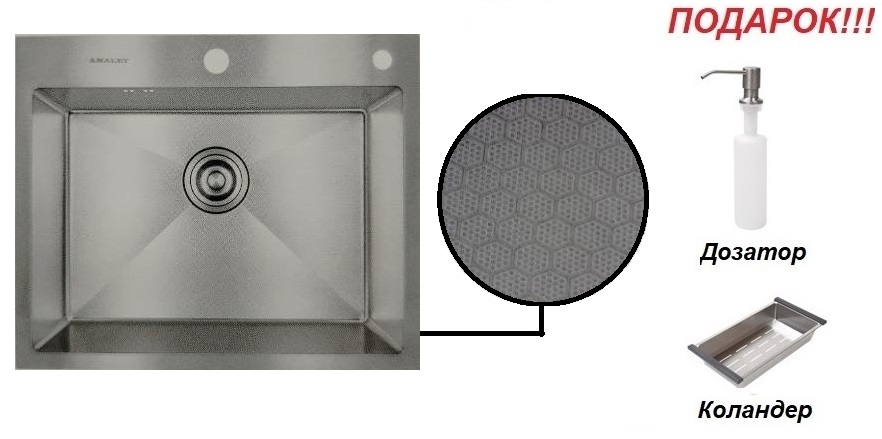 Мойка AMALET 58*48 HONEY, металлическая, САТИН + ПОДАРОК(дозатор и коландер)