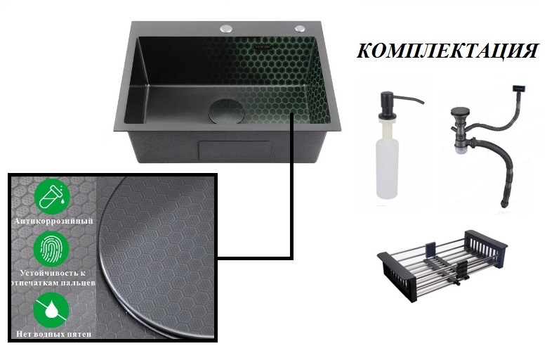 Мойка AVIVA 650*450мм,Нано Черный ДЕКОР.Комплектация:раздвижная корзина,дозатор,донный клапан,сифон